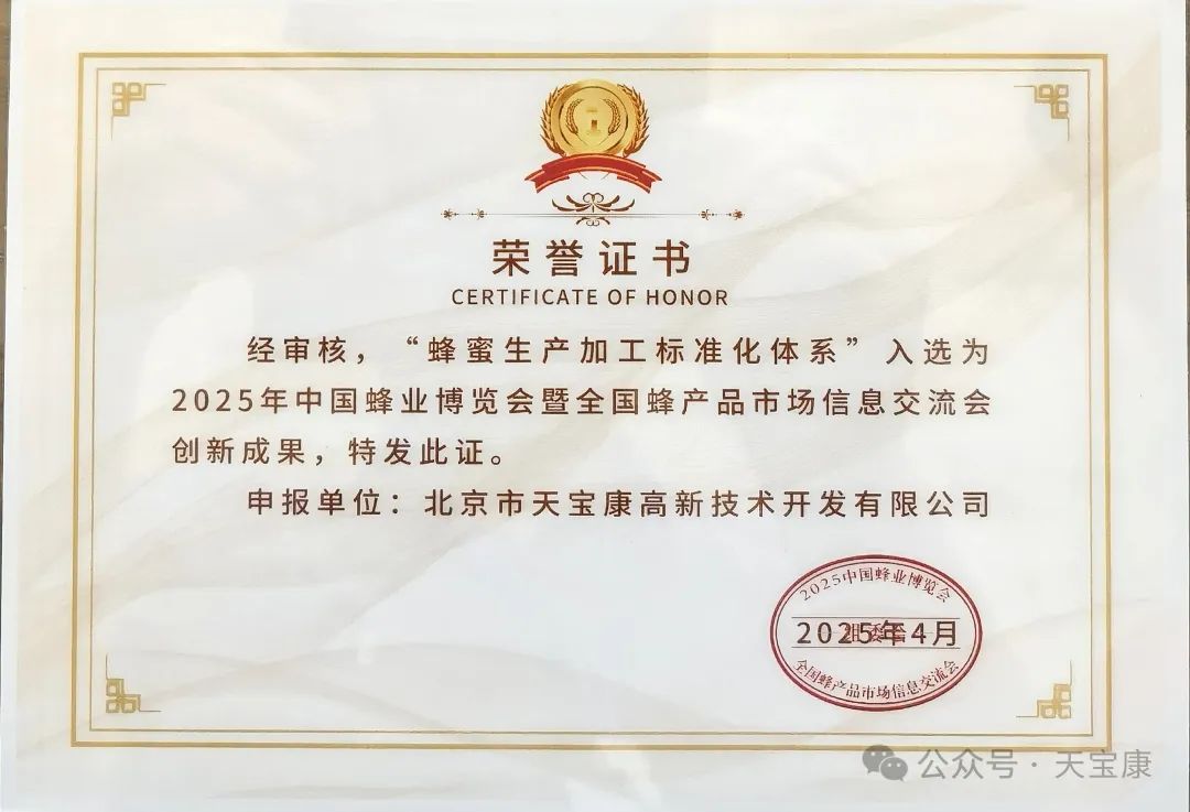 這份榮譽(yù),既屬于中國(guó)農(nóng)業(yè)科學(xué)院整個(gè)專家團(tuán)隊(duì),也屬于天寶康每一位為此付出努力的團(tuán)隊(duì)成員。它不僅是一張證書,更是一份責(zé)任——意味著我們的研發(fā)方向、創(chuàng)新的技術(shù)、設(shè)備及工藝,都得到了中國(guó)農(nóng)業(yè)科研體系的認(rèn)可;也意味著我們將在未來繼續(xù)以更高標(biāo)準(zhǔn)推動(dòng)中國(guó)蜜蜂產(chǎn)業(yè)向綠色化、高效化、標(biāo)準(zhǔn)化方向發(fā)展。